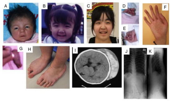 Clinical photographs of a patient with EDS caused by a carbohydrate sulfotransferase 14/dermatan 4-O-sulfotransferase-1 (CHST14/D4ST1) deficiency. Craniofacial features at the age of 23 days (A); three years (B); and 16 years (C) indicate hypertelorism; short and downslanting palpebral fissures, blue sclerae, a short nose with a hypoplastic columella, long philtrum, thin upper lip vermilion, small mouth, and micro-retrognathia at birth to early childhood. A slender and asymmetrical facial shape with a protruding jaw from adolescence is also observed. Congenital contracture of the fingers include adducted thumbs at 23 days (D,E); slender and cylindrical fingers and wrinkling palmar creases at 16 years (F); talipes equinovarus at birth (G); progressive foot deformities with talipes planus and valgus at 16 years (H); large subcutaneous hemtomas in a patient at the age of six years (I) and in another patient at the age of 16 years (J); kyphoscoliosis in a patient at the age of 16 years (J, K) (Figure (I) was reproduced from [44]; Figures (A,B,D,E,G,J,K) were reproduced from [45], with permission from Wiley-Liss, Inc., Hoboken, NJ, USA).