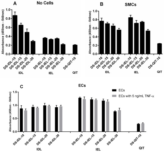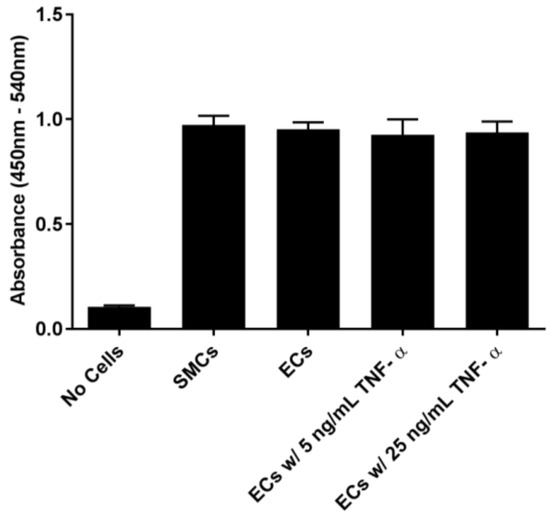 Monolayers of SMCs and ECs were seeded separately on Biocoat Collagen I Cellware 96-well plates (Corning, Corning, NY, USA). ECs were stimulated for four hours with 0.05–50 ng/mL tumor necrosis factor-α (TNF-α, Thermo Fisher Scientific), 10–100 ng/mL interleukin-1β (IL-1β, PeproTech, Rocky Hill, NJ, USA), 10–100 ng/mL interleukin-6 (IL-6, PeproTech), 10–100 ng/mL lipopolysaccharide (LPS, Sigma-Aldrich) or control (unstimulated) media. SMCs were cultured with only control (unstimulated) media. To block nonspecific binding, cells were treated with 1% bovine serum albumin (BSA, Sigma-Aldrich) in 0.05 M tris-buffered saline (TBS, 0.138 M NaCl, 0.0027 M KCl; pH 8.0, Sigma-Aldrich) for 30 min at room temperature with shaking. Primary rabbit polyclonal anti-E-selectin IgG (Santa Cruz Biotechnology, Dallas, TX, USA) or mouse monoclonal anti-E-selectin IgG2a (Santa Cruz Biotechnology) antibody was added (1:50 dilution of initial 200 μg/mL in 1% BSA in TBS) for one hour at 4 °C with shaking. Cells were rinsed three times with 1% BSA in TBS and secondary donkey anti-rabbit IgG HRP-conjugated (Thermo Fisher Scientific) or goat anti-mouse IgG HRP-conjugated (Thermo Fisher Scientific) antibody was added (1:1000 dilution of initial 0.5 mg/mL in 1% BSA in TBS) for 30 min at room temperature with shaking. Cells were rinsed three times with 1% BSA in TBS and colorimetric change was induced with 1:1 hydrogen peroxide: tetramethylbenzidine (R&D Systems, Minneapolis, MN, USA). Following 20 min of incubation with shaking, 2N sulfuric acid was added to cease the reaction and absorbance was measured at 450 nm and 540 nm using a SpectraMax M5 plate reader (Molecular Devices, Sunnyvale, CA, USA). For each individual well, 540 nm was subtracted from 450 nm to obtain final absorbance reading.