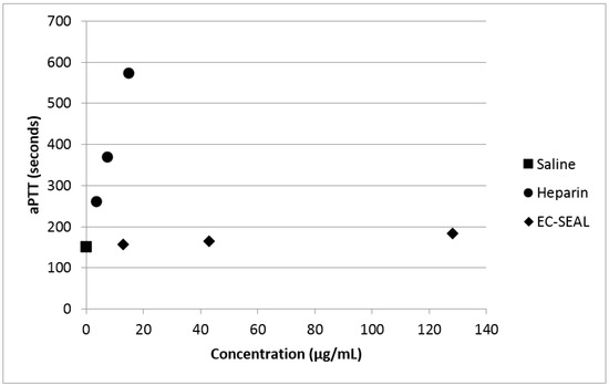 Activated partial thromboplastin time (aPTT) was measured using a Hemochron® Response (Accriva Diagnostics, San Diego, CA, USA) with associated reagents. The protocol was run according to manufacturer’s instructions. Briefly, whole blood was obtained from healthy volunteers in sodium citrate collection vials and 2 mL was added to the Hemochron® aPTT (citrated blood) test tube. One hundred microliters of saline, heparin or EC-SEAL was then added (final concentrations: 3.75–15 µg/mL heparin; 13–128 µg/mL EC-SEAL), and the test tube was shaken vigorously ten times from end-to-end. The test tube was then placed into the Hemochron® Response device and clotting time was recorded at completion.