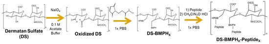 47]. After the peptide reaction was complete, semicarbazide hydrochloride (Sigma-Aldrich, St. Louis, MO, USA) was added directly to the solution to reduce any unreacted aldehyde groups. Subsequent SEC isolation and lyophilization resulted in the purified sixteen variants containing from one to thirty peptides per DS backbone of DS-BMPH