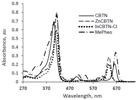 UV-vis absorption spectra of MePheo 1, CBTN 3, ZnCBTN 4, and InCBTN-Cl 5 in dichloromethane.