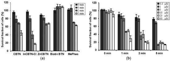 Bar plots of cell survival assay of colon cancer cell line. (a) After incubation with 5 μM photosensitizers (MePheo 1, CBTN 3, ZnCBTN 4, and InCBTN-Cl 5) and biotin, and irradiation for 0, 1, 2, and 5 min. (b) After incubation with varying concentrations of the indium (III) complex 5 and light irradiation for 0, 1, 2, and 5 min.