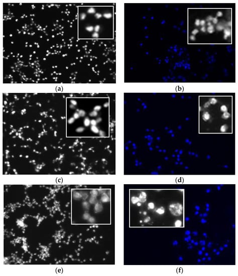 Fluorescence microscopy images of fixed human colon carcinoma cells. Grayscale and blue fluorescence images of CT cells alone stained with Hoechst 33258. Cell morphology of (a) untreated unirradiated cells (sham control); then, after treatment with 5 μM of (b) CBTN and irradiated for 2 min, (c,d) ZnCBTN dark and 2 min irradiation; and (e,f) InCBTN-Cl dark and 2 min irradiation. Apoptosis characterized by chromatin condensation and cell shrinkage is evident in InCBTN-Cl treated cells (f). Inserts present an enlarged view.