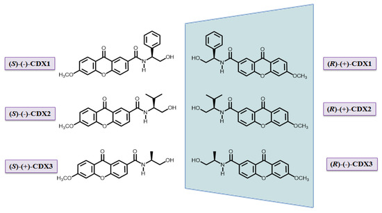 CDXs (Figure 1) were synthesized in enantiomerically pure form [40,41]. Briefly, a carboxyxanthone derivative, with the structure based on some bioactive xanthones from marine origin [31] was coupled with both enantiomers of commercially available chiral building blocks using O-(benzotriazol-1-yl)-N-N-N’-N’-tetramethyluronium tetrafluoroborate as coupling reagent and a catalytic amount of triethylamine in tetrahydrofuran, at room temperature. Liquid chromatography using different types of chiral stationary phases was used to determine the enantiomeric purity of the synthesized compounds [60,61], achieving enantiomeric excess values higher than 99%.
