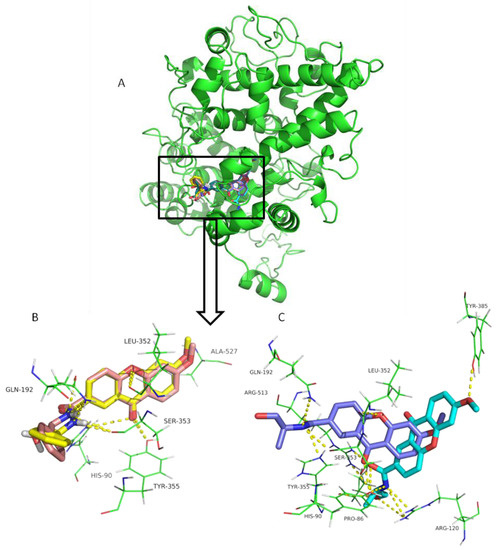 CDX1 enantiomers interact through hydrogen bonds with His90, Leu352, Ser353, Tyr355, and Ala527, also involved in the binding of known anti-inflammatory compounds to COX-2 [48,49,50]. CDX1 enantiomers bind similarly to COX-2 binding pocket, with the xanthone scaffold aligned approximately in the same special position, with a slightly different orientation of the aromatic ring and OH group of the chiral moiety (Figure 2B). (R)-CDX1 shows an additional hydrogen interaction between OH and Gln-192, similarly to celecoxib and valdecoxib. On the other hand, CDX3 enantiomers bind in very different poses in COX-2 binding pocket, almost perpendicular to each other (Figure 2C). In fact, (S)-CDX3 (Figure 2C, dark blue sticks) binds in a pose similar to CDX1, establishing hydrogen interactions with residues Gln192, His90, Ser353, Leu352, and Tyr355, documented as being important for COX-2 inhibition [50,51,52]. Concerning (R)-CDX3, the aromatic backbone projects deep COX active site from the hydrophobic channel, with the C3 chain establishing hydrogen interactions with Arg513, Pro86, and Arg120, and the C6-methoxy group establishing hydrogen interactions with Tyr385 (Figure 2C, light blue sticks), which is important in the catalysis or inactivation of the enzyme [53]. (S)-CDX-2 establishes hydrogen interactions with Gln192, Leu352, Ser353, His90, Tyr355, and Arg513; and (R)-CDX-2 establishes hydrogen interactions with Tyr385, Tyr355, Arg513, Pro86, and Arg-120 (not shown).