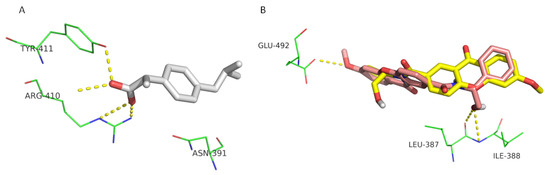 Interactions of crystallographic (S)-ibuprofen (yellow sticks) (A) and docked CDX1 enantiomers (B) with HSA. (R)- and (S)-enantiomers are represented in pink and yellow sticks, respectively. Hydrogen interactions are represented as yellow dashes and the residues evolved are represented as green lines and labeled.