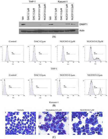 (A) Western blot comparing vehicle (veh) to decitabine (DAC) and NUC013 6 days after exposure to 0.1 µM and 0.2 µM of nucleoside and probing with DNA methyl transferase (DNMT1) antibody in human leukemia cells lines THP-1 and Kasumi-1; (B) Comparison of induction of apoptosis in THP-1 or Kasumi-1 cells by vehicle control, decitabine (0.2 µM) or NUC013 (concentrations as indicated in figure). Cells were co-stained with Annexin-V and PI on day 2 and analyzed by flow cytometry. Only Annexin-V data are presented because there were no changes in propidium iodide (PI) staining over the time period; (C) Photomicrographs of THP-1 cells treated with vehicle, decitabine or NUC013 on day 6 following drug exposure and stained with Giemsa (×630).
