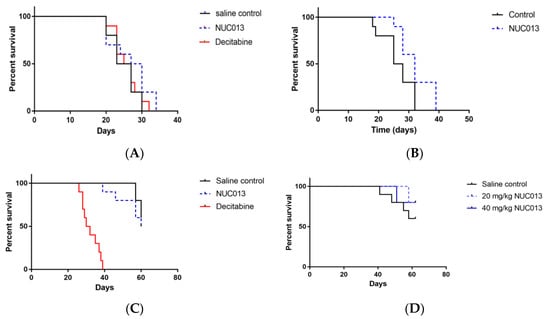Survival proportions in HL-60 and LoVo xenografts treated with decitabine or NUC013 (n = 10/group). “Survival” refers to animals that were not removed from the study by death or per protocol euthanasia. (A) Survival proportion in HL-60 xenografts. Saline control compared to decitabine (5 mg/kg) and NUC013 (5.8 mg/kg). Saline median survival (MS) = 25 days, decitabine MS = 26 days, and hazard ratio (HR) = 0.92 (p = 0.64, Log-rank test); NUC013 MS = 28.5 days and HR = 0.59 (p = 0.19, Log-rank test); (B) Survival proportion in HL-60 xenografts. Saline compared to NUC013 (20 mg/kg). Saline MS = 26.5 days, NUC013 MS = 32 days and HR = 0.26 (p = 0.032, Log-rank test); (C) Survival proportion in LoVo xenografts. Saline control compared to decitabine (5 mg/kg) and NUC013 (5.8 mg/kg). Saline MS undefined, decitabine MS = 31 days and HR of 26.89 (p < 0.0001, Log-rank test); NUC013 MS = 60 days and HR = 1.64 (p = 0.48); (D) Survival proportion in LoVo xenografts. Saline control compared to 20 mg/kg and 40 mg/kg NUC013. MS undefined.