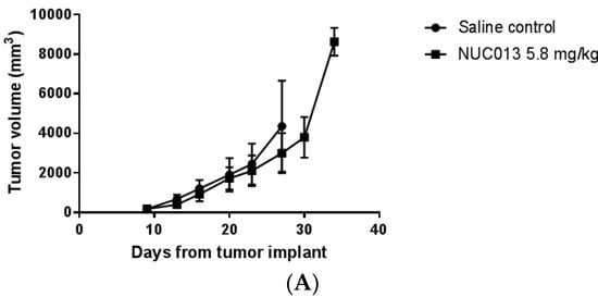 In the second study, the mean tumor volume at study initiation was 33 mm3 and treatment with NUC013 (20 mg/kg) significantly improved MS (p = 0.032) (Figure 3B). Furthermore, significant decreases in tumor volume (p < 0.05, Mann-Whitney U test, two-tailed) were noted on study days 18 through 28 (see Figure 4B), reaching a maximum on study days 21 and 25 (47.8% lower than saline control).