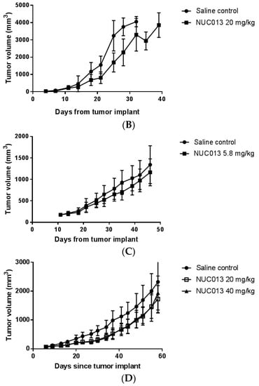 Tumor volume as a function of time since tumor implant. The first data point on each graph is on the day of study drug treatment initiation. Values are ± standard deviation. (A) HL-60 comparison of NUC013 5.8 mg/kg vs. saline control; (B) HL-60 comparison of NUC013 20 mg/kg vs. saline control; (C) LoVo comparison of NUC013 5.8 mg/kg vs. saline control; (D) LoVo comparison of NUC013 20 mg/kg and 40 mg/kg vs. saline control.