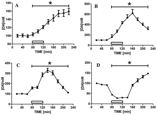 2.6. Effect of NO-Donor Molecules on Dialysate Levels of DA