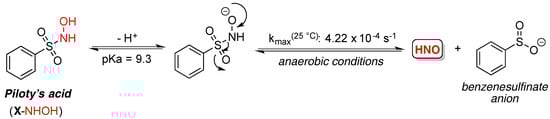 - Sirsalmath, K.; Suárez, S.A.; Bikiel, D.E.; Doctorovich, F. The pH of HNO donation is modulated by ring substituents in Piloty’s acid derivatives: Azanone donors at biological pH. J. Inorg. Biochem. 2013, 118, 134–139. [Google Scholar] [CrossRef] [PubMed]