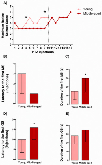 To better investigate the effects of aging on epileptogenesis induced by kindling, young and middle-aged rats were injected with PTZ, as previously described (see protocol design in Figure 5). As shown in Figure 1A, the middle-aged rats presented a higher resistance along kindling protocol when compared with younger following the 4th (H1,28 = 4,69, p = 0.03) and 9th (H1,28 = 4,50, p = 0.03) PTZ injections. Further, as revealed by the Mann-Whitney test, middle-aged rats displayed an increased duration of the first myoclonic seizure (U = 46, p = 0.03, Figure 1C) and an increased latency to the first generalized seizure (U = 32, p = 0.004, Figure 1D) during kindling in comparison to young rats.