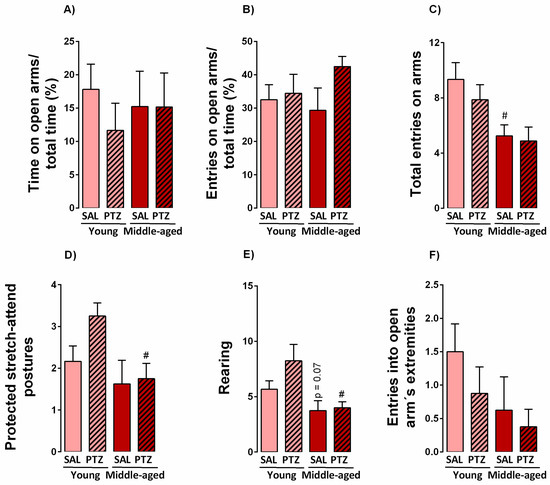 To determine the effects of kindling on anxiety-like responses of middle-aged rats, we examined the behavioral profile of kindled rats in the elevated plus-maze test. Two-way ANOVA indicated no significant differences for treatment (saline versus PTZ) or age factors (young versus middle-age) in the time spent and number of entries in the open arms of the maze (Figure 2A,B). Moreover, two-way ANOVA indicated a significant effect for age factors in the number of entries into enclosed arms (F1,32 = 10,3, p < 0.005) (data not shown) and the total number of entries on arms (F1,32 = 9,84, p < 0.005). Subsequent Newman-Keuls tests indicated a decreased number of this parameter in middle-aged rats treated with saline (Figure 2C). Two-way ANOVA also revealed significant differences for age factors when ethologic behaviors such as protected stretch-attend postures F1,32 = 5,99, p < 0.05) and rearing (F1,32 = 10,2, p < 0.005) were evaluated. Subsequent Newman-Keuls post-hoc tests indicated that kindled middle-aged rats were prone to reduce the number of protected stretch-attend postures and rearing behaviors (Figure 2D,E) when compared to kindled younger rats. The number of entries into open arm´s extremities was not significantly altered by treatment or age factors (Figure 2F).