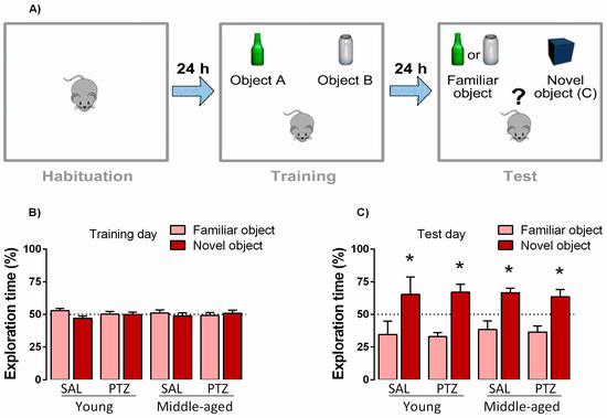 Effects of kindling on cognitive performance of middle-aged rats on object-recognition task. Experimental timeline (A). Values are represented by the mean ± S.E.M., followed by Student’s t-test when required during training (B) and test (C) days. * p < 0.05 in the comparison between familiar and novel objects (n = 8–12/group).