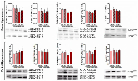 Effects of kindling on expression of mitogen-activated protein kinases (MAPKs) (ERK 1/2, JNK p54/p46, p38) into the dorsal and ventral hippocampus of middle-aged rats. Values are represented by the mean + S.E.M. followed by two-way ANOVA (n = 6/group).
