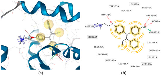 (a) Pharmacophore-Molecular Docking Based of 4-OHT with ERα derived from the X-ray derived structure (PDB code: 3ERT). Hydrophobic, positive ionizable, hydrogen bond donor and acceptor interactions are depicted as yellow spheres, blue star, green and red arrows, respectively. (b) The 2D-depiction illustrates a hydrophobic pocket with hydrophobic interactions with the binding site residues. Interactions derived and depicted using LigandScout 4.1 Advanced. Hydrogen atoms on the ligand and excluded volumes (restricted areas that define the shape of the binding pocket) are not displayed.