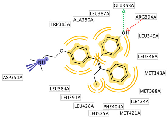 The X-ray derived structure of ERα in complex with 4-OHT (PDB code: 3ERT) was selected for molecular docking studies of ChalcEA due to good parameters for experimental resolution (1.9 Å), R-value free and R-value work of 0.262 and 0.229, respectively [12]. The interactions derived from the X-ray derived structure revealed that 4-OHT formed hydrophobic interactions predominantly with the butenyl group and aromatic rings, a positive ionizable interaction with primary the tertiary amine nitrogen and hydrogen bond interactions with the phenoxy and hydroxyl oxygens (Figure 1a,b).