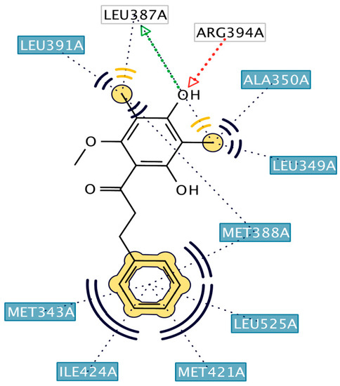 Both HNS9 and HNS10 formed hydrogen bonds with Leu346, Glu353, and Arg394 (Figure 6b). The formation of hydrogen bonds with Glu353 and Arg394 is essential for binding to ERα [17], which is in agreement with the previous docking studies involving chalcone [18]. Hydrophobic interactions also contributed to the overall binding of ChalcEA derivatives with ERα. The aromatic rings of HNS9 and HNS10 formed CH-pi hydrophobic interactions with Ala350, Met421, and Leu525 (Figure 6).
