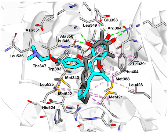 Overlay of the docked pose of ChalcEA (gray) and 4-hydroxy-tamoxifen (4-OHT) (blue) in the binding site of estrogen receptor alpha (ERα). Hydrogen bond and pi-alkyl interactions are represented in green and pink colored dashed lines, respectively.