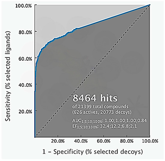 Receiver operating characteristic (ROC) curve validation of the 3D structure-based pharmacophore model using a set of 626 estrogen receptor alpha active and 20,773 decoy molecules.