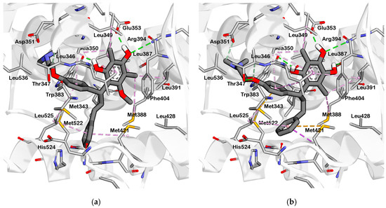 HNS9 and HNS10 displayed the best pharmacophore fit scores compared to the other derivatives and ∆G free energy of binding (−12.01 kcal/mol and −12.33 kcal/mol, respectively) better than 4-OHT (−11.04 kcal/mol). HNS9 formed ten hydrophobic contacts with Met421, Leu525, Met343, Asp351, Thr347, Ala350, Leu349, Leu391, Leu384, and Met388, and four hydrogen bonds with Leu346, Glu353, Arg394, and Leu387 (Figure 6a), whereas HNS10 formed eight hydrophobic contacts with Met421, Leu525, Thr347, Ala350, Leu387, Leu349, Met388, and Leu391, and three hydrogen bonds with Leu346, Glu353, and Arg394.