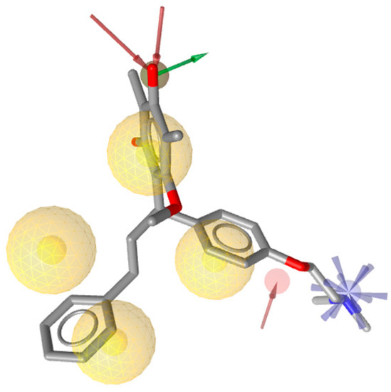 Figure 7 shows that the hydroxyl groups in ortho position on HNS9 hindered the complete mapping with all four hydrophobic features of 4-OHT (Figure 7a). In contrast, the meta position of hydroxyl groups on the aromatic ring of HNS10 enabled a better alignment with the center of the hydrophobic features, thus resulting in a higher fit score (Figure 7b).