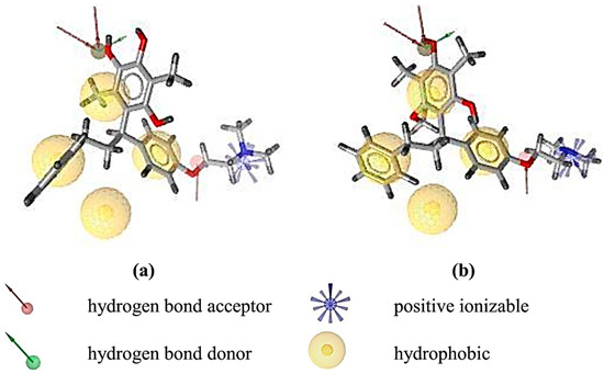 Fit of the (a) HNS9 (b) HNS10 to the structure-based pharmacophore model derived from 4-OHT with ERα from PDB code: 3ERT. The models were generated using LigandScout 4.1 Advanced. Virtual screening was performed leaving at least two features out. The ligands fit six of the eight features and all of the excluded volumes.