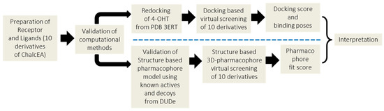 One promising natural anti-breast cancer adjuvant compound is chalcone, a flavonoid group secondary metabolite found in many plants. The 2′,4′-dihydroxy-6-methoxy-3,5-dimethylchalcone (ChalcEA) from the leaves of Eugenia aquea inhibited the cell proliferation of MCF-7 human breast cells, in a dose-dependent manner, with an IC50 of 74.5 μg/mL (250 μM). It has been hypothesized to promote apoptosis via the activation of poly(adenosine diphosphate-ribose)polymerase (PARP). Further investigations have provided a basis for its use in breast cancer disease management [7]. However, its IC50 value was considered as a moderate level of inhibition compared to tamoxifen [8]. Therefore, further efforts to improve the inhibitory activity of ChalcEA through structural modifications guided by computer-aided drug design (CADD) methodologies, such as molecular docking method and 3D-pharmacophore modeling, were explored in this study.