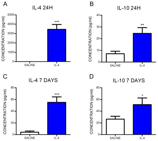Interleukin-4 (IL-4) administered intraperitoneally reaches systemic circulation and promotes an elevation of the anti-inflammatory cytokine IL-10. The serum concentration of the cytokine IL-4 at 24 h (A) and 7 days (C) post-injury and IL-10 at 24 h (B) and 7 days (D) post-injury are significantly increased in the IL-4-treated rats. Values shown as mean ± SEM. * p < 0.05; ** p < 0.01; *** p < 0.001.