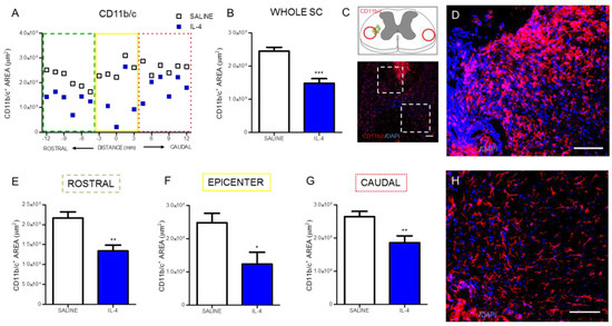 Analysis of CD11b/c-positive cells revealed that IL-4 treatment significantly decreased the area occupied by macrophages (Figure 2A,B) on the spinal cord. The analysis of specific regions of the spinal cord demonstrated that the significant decrease of macrophages occurred both rostral (Figure 2E) and caudally to the epicenter (Figure 2G), as well as around the epicenter area (Figure 2F).