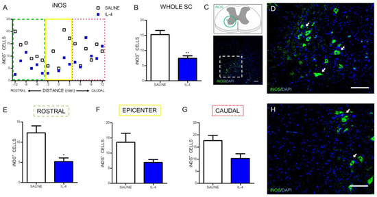 IL-4 treatment reduces the number of iNOS-expressing cells in the injured spinal cord. Distribution of iNOS+ cells along the rostrocaudal axis of the spinal cord (A); Quantification of iNOS+ cells in the whole spinal cord revealed a significant reduction of iNOS-producing cells in IL-4-treated rats (B); A significant reduction of iNOS-expressing cells was also observed in the rostral (E) area of the spinal cord but not at the epicenter (F) and in the caudal (H) regions. Schematic and low-magnification photomicrograph indicating areas where the analyses were performed (dashed lines) (C); Representative images of positive staining for iNOS+ cells of saline (D) and IL-4 treated (H) group. Values shown as mean ± SEM. * p < 0.05; ** p <0.01. Scale bar = 100 µm.