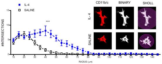 IL-4 treatment promotes a more ramified morphology (less active) on macrophages/microglia. On the right, microglia immunofluorescence images were transformed into binary and then analyzed with a sholl plot. Then, it was quantified the number of intersections with each sholl plot concentric circle. *** p < 0.001.