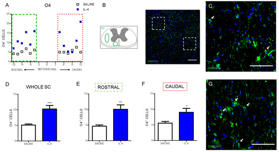 IL-4 treatment increases the number of oligodendrocytes in the injured spinal cord. Distribution of the O4+ cells along the rostrocaudal axis of the spinal cord (A); Quantification of O4+ cells in the whole spinal cord revealed a significant increase of oligodendrocytes in IL-4-treated rats (D); A significant increase of oligodendrocytes was also observed in the rostral (E) and caudal (F) regions of the injured spinal cord. Schematic and low-magnification photomicrograph indicating areas where the analyses were performed (dashed lines) (B); Representative images of positive staining for oligodendrocytes of saline (C) and IL-4 treated (G) group. Values shown as mean ± SEM. * p < 0.05; ** p < 0.01; *** p < 0.001. Scale bar = 100 µm.