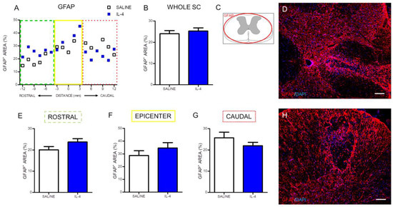 The effect of IL-4 on astrocytes was also evaluated using immunohistochemistry against the glial fibrillary acidic protein (GFAP). The positive stained area for GFAP was quantified along the rostral to caudal axis of the spinal cord (Figure 8A). The analysis demonstrated that IL-4 treatment did not alter GFAP-positive stained area in any region of the spinal cord (Figure 8).