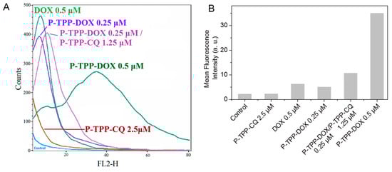 (A) Flow cytometry profiles of DOX fluorescence and (B) quantitative analysis of mean fluorescence intensity within DU145 human prostate cancer cells incubated with free DOX (0.5 μM), with P-TPP nanocarrier encapsulating DOX (P-TPP-DOX, DOX concentrations 0.25 μM and 0.5 μM) or chloroquine (P-TPP-CQ, CQ concentration 2.5 μM) and with both P-TPP-DOX and P-TPP-CQ (P-TPP-DOX 0.25 μM/P-TPP-CQ 1.25 μM).