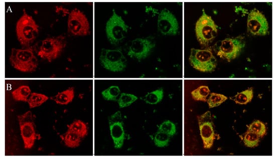 The mitochondriotropic characteristic of the P-TPP nanocarrier, as previously established [], has been utilized for targeting DOX in mitochondria by administering P-TPP-DOX to human prostate carcinoma DU145 cells. In this study, further laser scanning confocal microscopy (CLSM) studies have been employed on live DU145 cells, utilizing the intrinsic fluorescence of DOX and its ability to intercalate into DNA, in order to verify its intracellular localization after administering P-TPP-DOX either alone or together with P-TPP-CQ. It is well established that DOX encapsulated in P-TPP is localized in mitochondria [] in contrast to free DOX, which is specifically localized in cell nuclei [,], and our confocal microscopy studies further corroborate this notion. Indeed, from the corresponding CLSM images (Supplementary Materials, Figure S3), DOX is predominantly located in the nucleus or its membrane, while no co-localization is observed with MitoTracker® Green FM (Cell Signaling Technology, Inc., Beverly, MA, USA). On the contrary, as shown in the obtained confocal indicative images of cells treated with P-TPP-DOX at a 0.5 μΜ DOX concentration (Figure 2A and Figure S4A), it is evident that DOX is not located in the cell nuclei, but it is efficiently co-localized with MitoTracker® Green FM in cell mitochondria (green + red = yellow). This result corroborates the already established mitochondrial affinity of P-TPP-DOX. At even lower DOX concentrations (0.25 μΜ DOX encapsulated in P-TPP), the corresponding CLSM images (Supplementary Materials, Figures S5 and S6) still show, although in less detail, that DOX is localized outside the cell nuclei. Live cell images obtained following co-administration of P-TPP-CQ with P-TPP-DOX (Figure 2B and Figure S4B) also exhibit the same distinct fluorescence pattern suggesting DOX mitochondrial localization even in the presence of P-TPP-CQ at various concentrations. The findings support the fluorescence emission profiles obtained from flow cytometry experiments and ascertain that administration of CQ encapsulated in P-TPP does not negatively compete with DOX internalization.