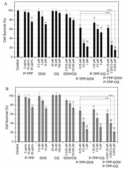 Comparative toxicities of P-TPP (carrier), free DOX, CQ and their combination, as well as of P-TPP-DOX, P-TPP-CQ or their combination on PC3 (A) and DU145 cells (B) following incubation at various concentrations for 3 h as determined by MTT assays 24 h following incubation. In all P-TPP-DOX experiments, the encapsulated DOX concentration was 0.25, 0.5 or 1 μM, and the corresponding carrier concentration was 5, 10 and 20 μg/mL (corresponding to 1.75, 3.5 and 7.0 μM of P-TPP). The statistical significance, resulting from Student’s paired two-tailed t-tests, follows the assignment: * p < 0.05, ** p < 0.01, *** p < 0.001 and **** p < 0.0001, while no annotation implies no statistical significance, p > 0.05.