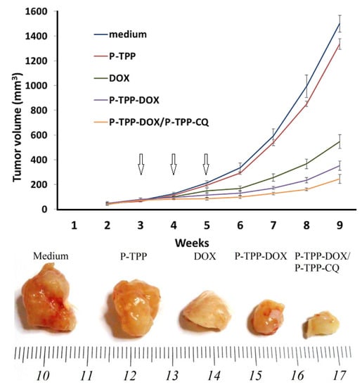 To investigate with in vivo studies the activity of P-TPP encapsulated DOX and CQ, we grafted the cell line DU145 into SCID mice, since DU145 cells are refractory to androgens and do not express the ARα or ERα []. To this end, we administered free DOX, P-TPP encapsulated DOX and the combination of P-TPP-DOX with P-TPP-CQ once a week and for a total period of three weeks and compared the results with the control group (medium only) and the group administered the nanocarrier at an equivalent concentration. Co-administration of P-TPP encapsulated CQ and DOX had the greatest impact on tumor growth, being significantly more potent than DOX (p < 5.1 × 10−6) and P-TPP-DOX (p < 0.001), as well (Figure 4). Specifically, tumors in the control and in vehicle-treated animals reached exponential growth kinetics (Figure 4, upper diagram). In comparison, tumor growth in DOX-treated animals was attenuated, and the P-TPP-DOX- and P-TPP-DOX/P-TPP-CQ-treated animals manifested the most significant growth attenuation. Especially during the three-week administration period (marked with arrows in Figure 4), complete tumor growth arrest was observed for mice administered with P-TPP-DOX/P-TPP-CQ. In addition, both animal groups treated with P-TPP-DOX and P-TPP-DOX/P-TPP-CQ exhibited normal movement capability, and normal, expected overall behavior. Finally, no pervasive side effects could be noted during the observation period for these groups.