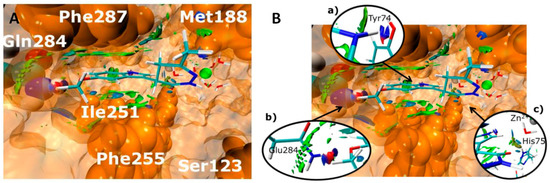 PDE4-3c interface, using promolecular densities. (A) best pose (⊗G = −5.3 kcal·mol−1) and (B) focus on specific interactions.