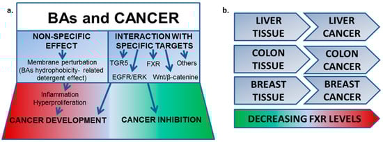 (a) Schematic summary of the involvement of BAs in cancer; (b) FXR expression decreases from healthy to cancer tissues.