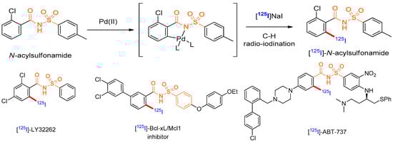 (Upper) Palladium-mediated C-H radioiodination. (Lower) Structures of [125I]-LY32262, a [125I]-Bcl-xL/Mcl1 and [125I]-ABT-737.