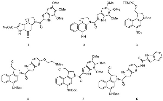 Structures of Duocarmycin SA, 1, amino-CBI, 2, Key intermediate, 3, final seco-amino-CBIs, 4–6.