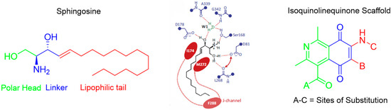 Sphingosine docking into the narrow J-channel in the active site of SK1. Transposing the general regions of sphingosine onto the proposed isoquinolinequinone template affords a versatile, novel potential inhibitor.