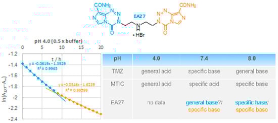 The archetypal prodrug of the imidazotetrazine class is the anticancer agent temozolomide (TMZ). The prodrug activation kinetics of TMZ show an unusual pH dependence: it is stable in acid and rapidly hydrolyses in alkali (Denny, B.J., et al. Biochemistry 1994, 33, 9045–9051). The incipient drug MTIC has the opposite properties—relatively stable in alkali but unstable in acid. In this study, the mechanism of prodrug activation was probed in greater detail to determine whether the reactions are specific or general acid or base catalysed. Three prodrugs and drugs were investigated, TMZ, MTIC and the novel dimeric imidazotetrazine EA27. Hydrolysis in a range of citrate-phosphate buffers (pH 8.0, 7.4, 4.0) was measured by UV spectrophotometry.