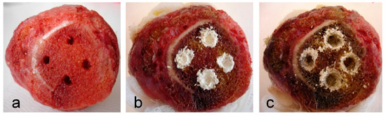 Femur head (a) with drilled holes infected with bacteria; (b) filled with a peptide blended with local carrier (ChronOS Inject), local carrier alone, and local carrier loaded with antibiotic; (c) after removal of the fillings (representative example).