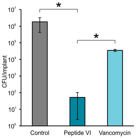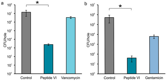 The results of these experiments, as shown in Figure 2a,b, clearly demonstrate that, contrary to the antibiotic (vancomycin or gentamicin), peptide VI used for the treatment of both staphylococcal infections significantly reduces (p < 0.05) the bacterial load in the holes when compared to the control.