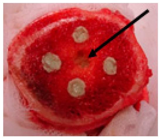 Femur head with inserted implants prepared from poly(methyl methacrylate)-based bone cement (Palacos®r, Wehrheim, Germany) loaded with a peptide and from plain bone cement. Bacteria that were pipetted to the hole between them (arrow) infiltrated through the spongy part of the bone towards the implants, adhered to them and subsequently either formed a biofilm on their surfaces or did not (example representative of the experiments).