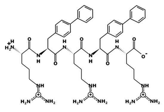 It was observed that according to previous studies aimed to design ultrashort peptides that using only two lysine or two ornithine amino acids to represent charged residues has led to loss of activity [28]. Further investigations showed that the antimicrobial and antibiofilm activity was significantly reduced as a result of replacing arginine with lysine residues due to favoring particular binding characteristics to bacterial membrane and DNA [39,40]. These results prove that membrane disruption is cation residue specific and furthermore cationic charges must arise from arginine and not lysine or ornithine, especially when the peptide is ultrashort in length. On the other hand, the hydrophobic moieties were represented by tryptophan which has a significant preference for the membrane interface compared to other hydrophobic amino acids. Also, biphenylalanine was used to represent hydrophobic moieties in order to enhance membrane insertion properties and using it led to reinforce peptide activity against methicillin-resistant staphylococcus aureus (MRSA) [28,41]. Furthermore, incorporation of non-natural amino acids was used as a main strategy to enhance peptide stability [42,43]. The biphenylalanine motif was reported as the shortest antimicrobial peptide-based agent. A severe damage to bacterial morphology and bacterial cell death were observed as a result of biphenylalanine interaction with bacterial cell membrane [44]. Besides that, the substitution of H by phenyl group in biphenylalanine is expected to incorporate a superior biological protection against enzymatic degradation compared to other non-natural motifs used alkyl substitution. This stability enhancement is secured via increasing basicity and decreasing polarity in addition to eliminate the predominance of trans versus cis peptide bond confirmation and some inter- and intramolecular hydrogen bonds [42,45].