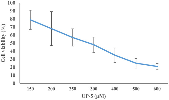 Cell viability (%) of Vero mammalian cells as a response to different UP-5 concentrations exposure. Bars represent the standard deviation (±SD). Values represent means of three different experiments.